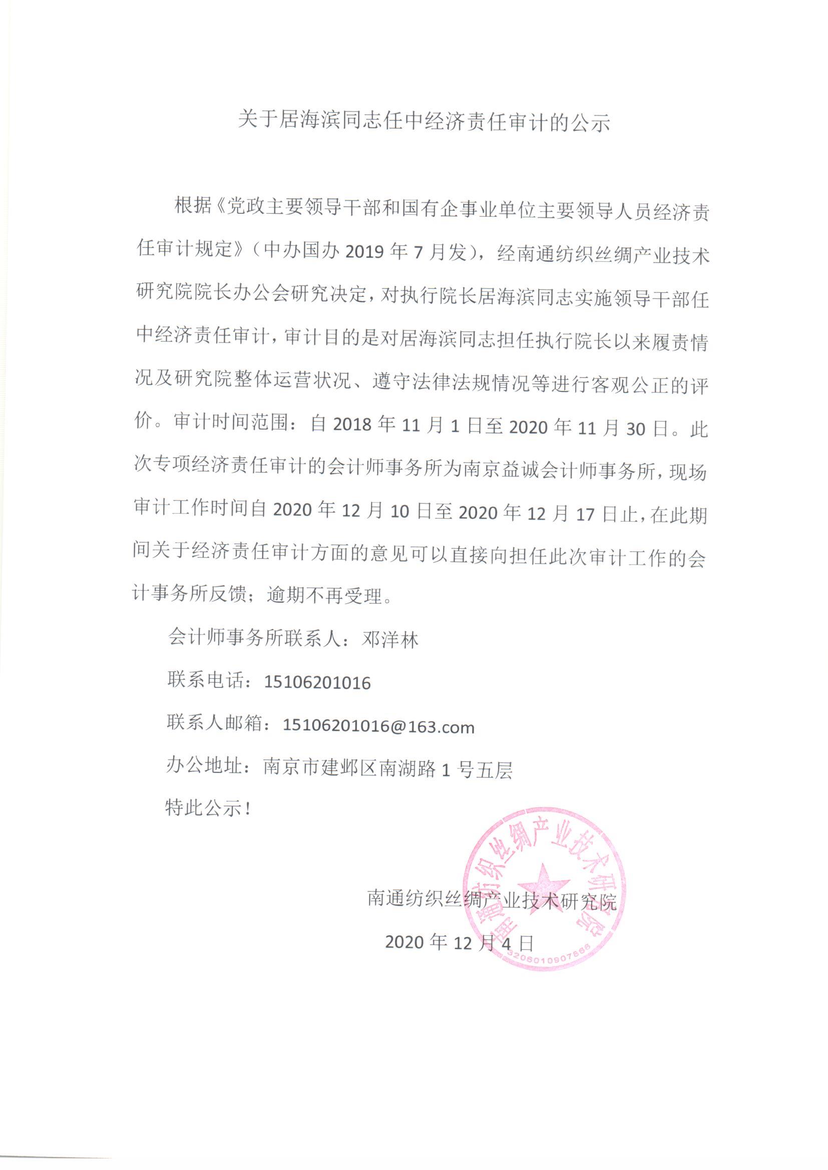 关于居海滨同志任中经济责任审计的公示